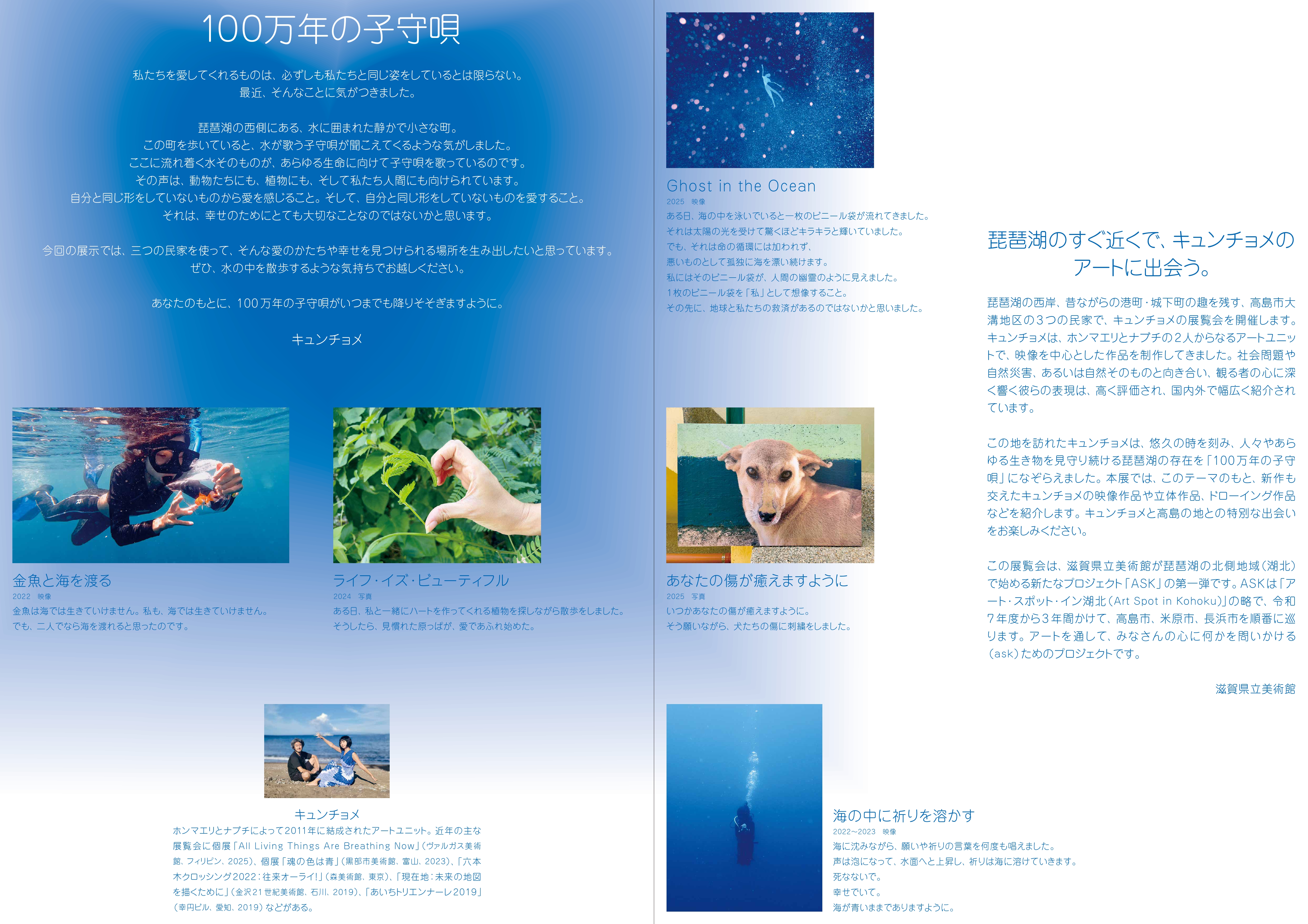 本展は、2人の関西での初個展となります。「100万年の子守唄」のタイトルは、有数の古代湖である琵琶湖、またその周辺で水とともに住まう人たちの高島市大溝地区にインスパイアされたキュンチョメによる命名です。展示では、「水」の存在が印象的な映像作品や、自然と人間のつながりを問う写真作品、また本展が初展示となる4点の新作(《あいまいな地球に花束を》《あなたの傷が癒えますように》《Ghost in the Ocean》《ライフ・イズ・ビューティフル》)など計8点(平面作品2点、立体作品3点、映像作品3点)を展示します。琵琶湖にほど近い環境で、キュンチョメの近作や新作を、まとまって鑑賞できる特別な機会となります。