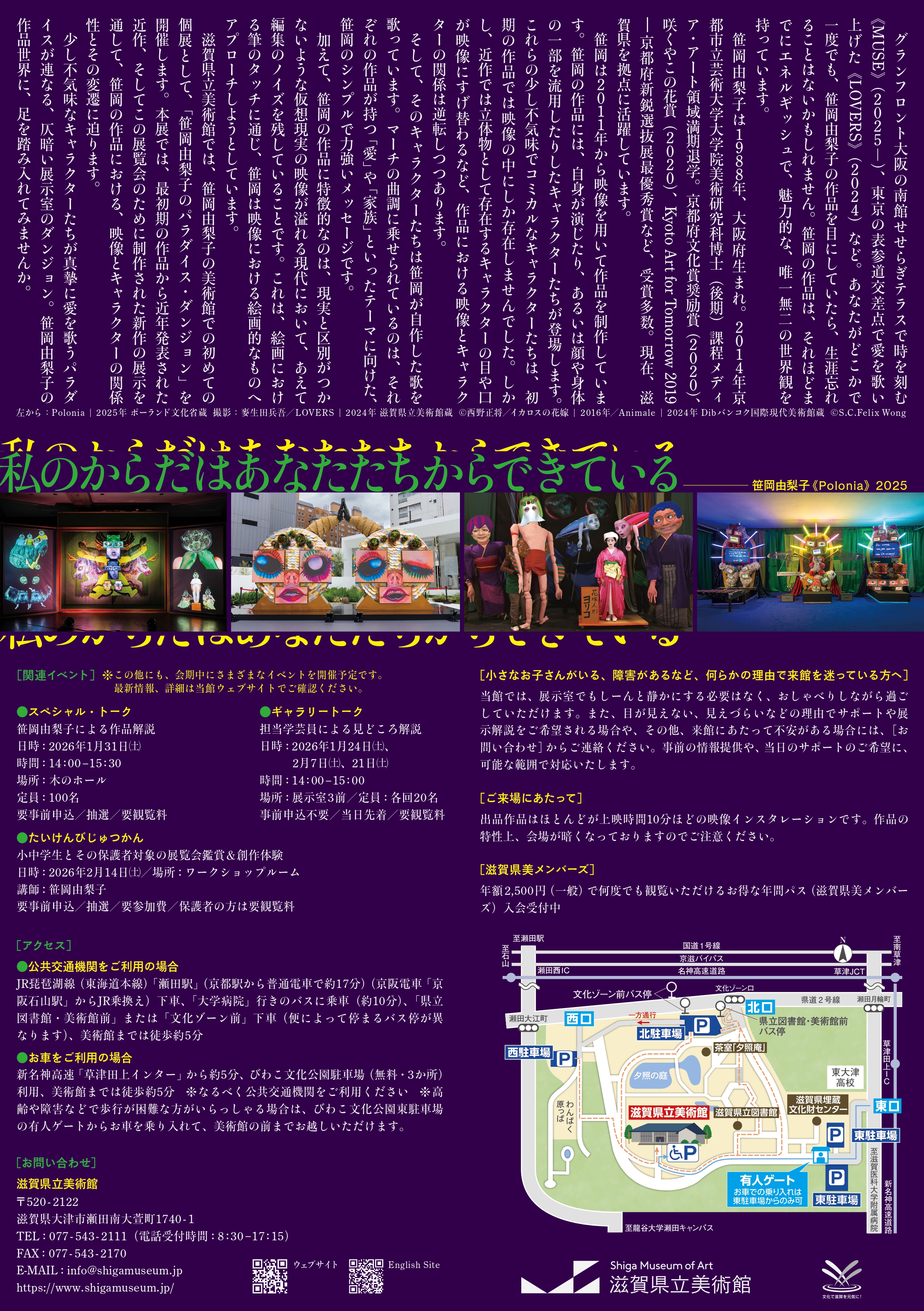 笹岡由梨子は、滋賀を拠点に国内外で活躍しています。近年では、東京の表参道交差点での《LOVERS》(2024年)や、グランフロント大阪に設置された《Muse》(2025年)、大阪万博の関連イベントでの《Polonia》(2025年)の展示などで、大変注目を集めました。また、国立国際美術館で現在開催中の特別展「プラカードのために」にも参加しています。