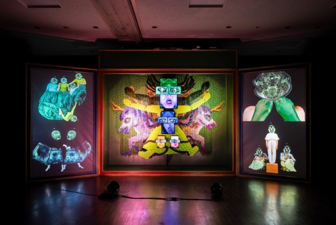 既存作だけではなく、本展のために制作された新作《タイマツ》を初公開。料理をテーマにした本作は、横幅7メートルを超える万華鏡仕立ての映像を中心としたインスタレーションです。