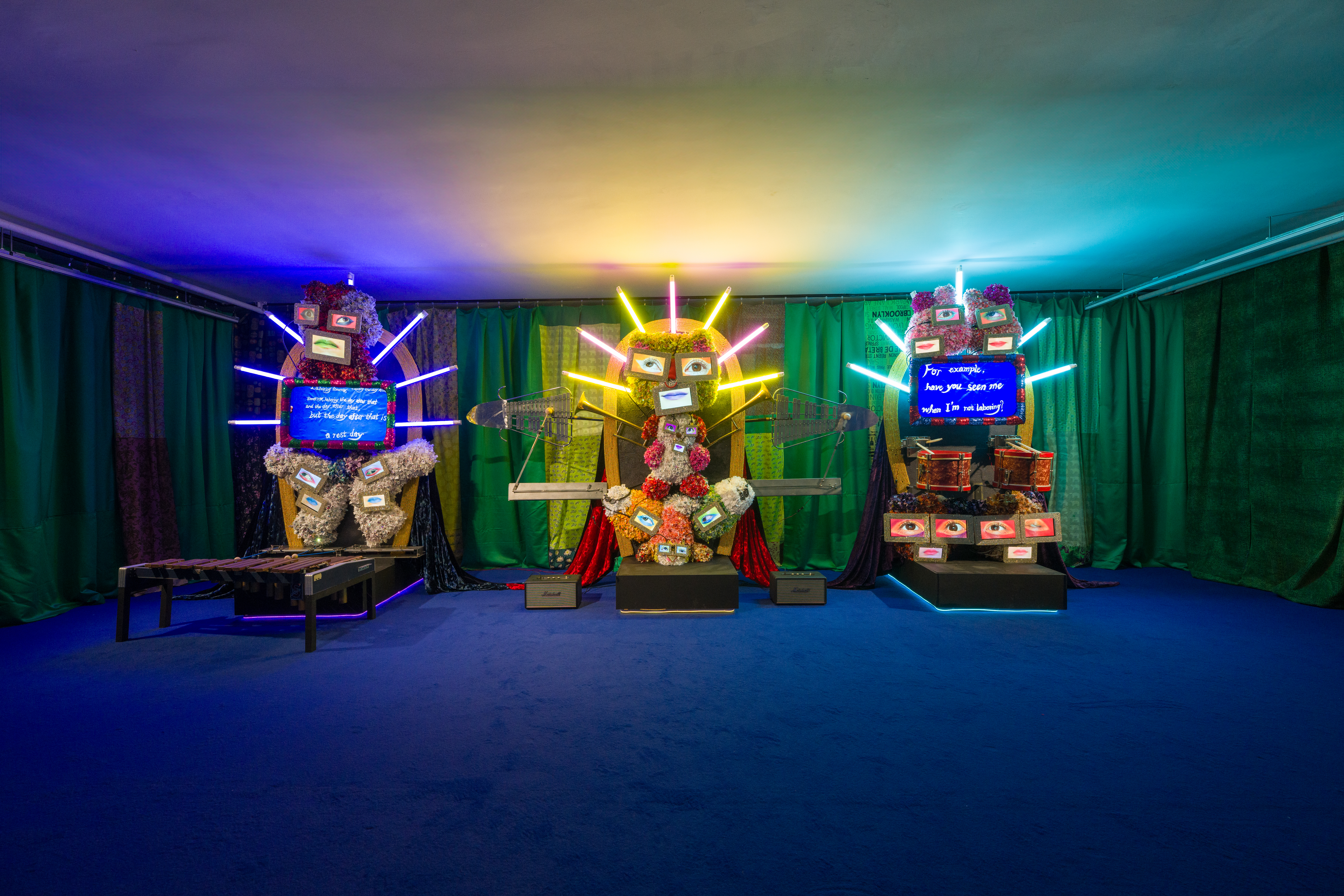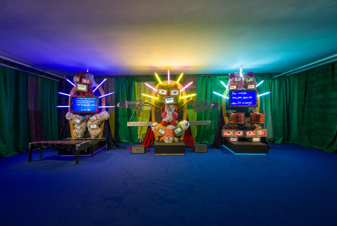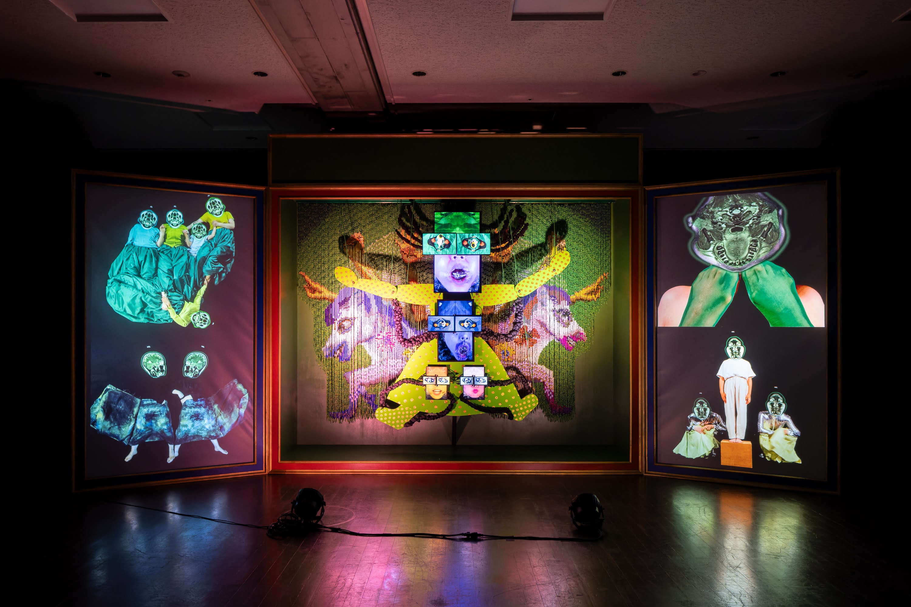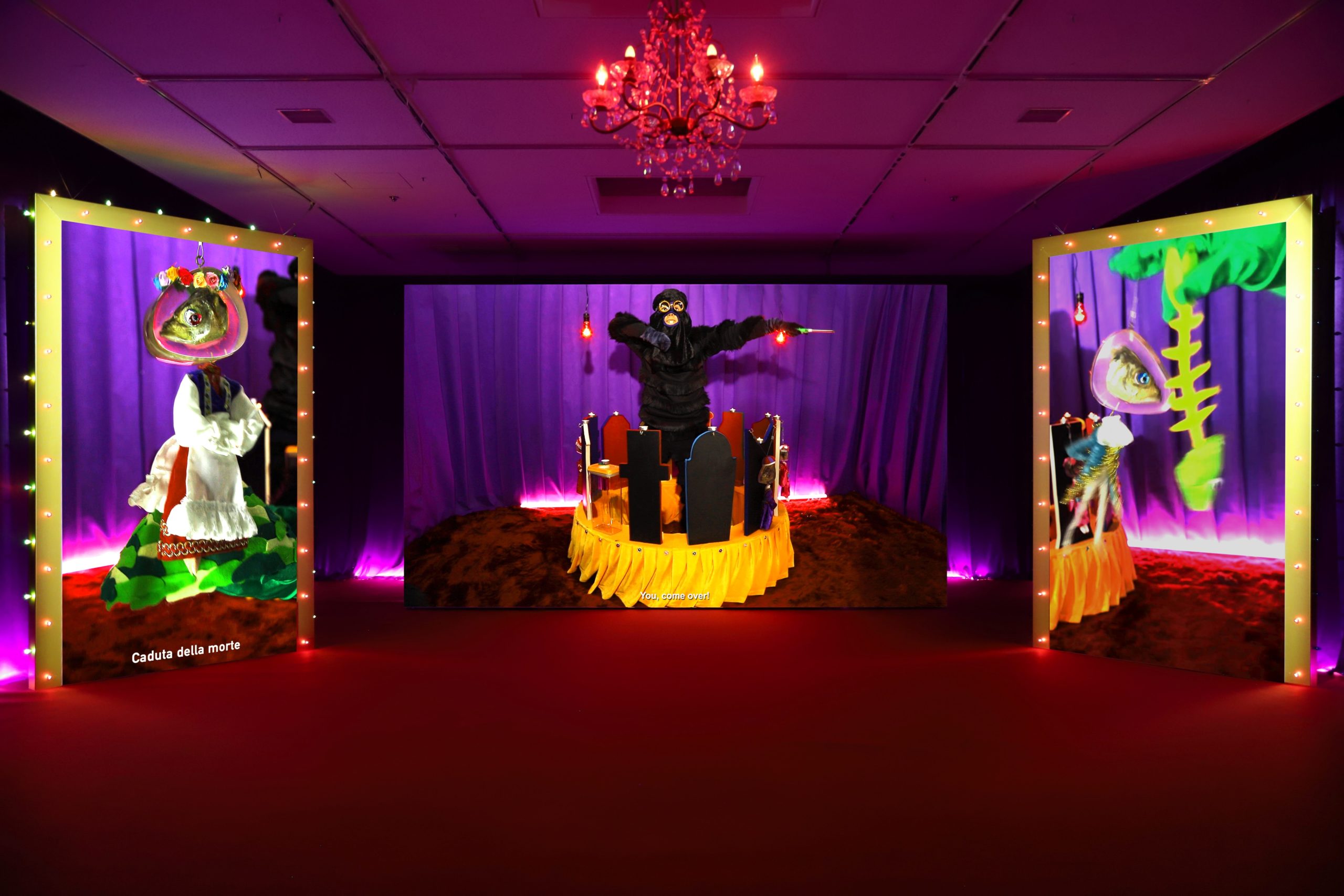 出品作品はほとんどが上映時間10分ほどの映像インスタレーションです。作品の特性上、会場が暗くなっておりますのでご注意ください。