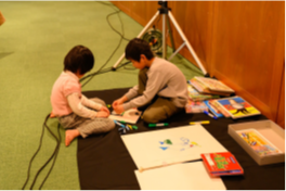 床に敷くシート、ペン、画用紙、絵本などで会場内に簡易なキッズスペースを準備し、参加者にはキッズスペース近くに着席してもらい、イベント開催中は同じ部屋で過ごしていただきました。